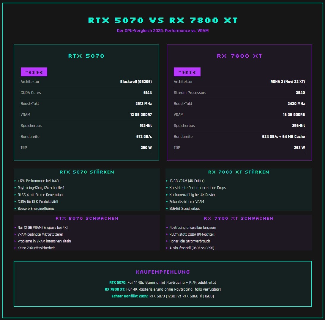 Du stehst vor einer Entscheidung, die 2025 schwieriger ist als je zuvor. Auf der einen Seite: eine brandneue RTX 5070 mit Blackwell-Architektur, DLSS 4 und beeindruckender Rechenpower. Auf der anderen: eine bewährte RX 7800 XT mit 16 GB VRAM – 4 GB mehr als die Nvidia-Karte.