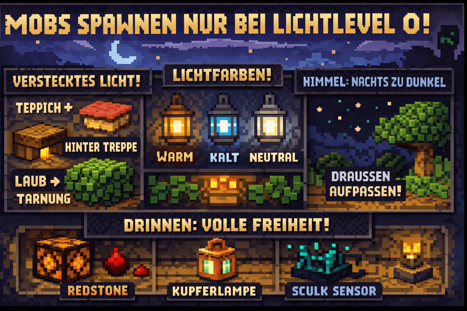 Fehler 4: Himmelslicht ignorieren Drinnen bist du safe. Draußen spawnen Mobs nachts trotzdem, auch wenn Lichtlevel > 0 ist. Denk dran.