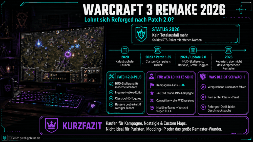 | Reddit-Stimmen | „Spielbar, aber Oldschool-Ergonomie“ | 2026-02-16 | Kaufbar, falls man WC3 digital/aktuell will |