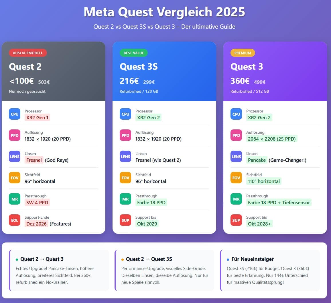 Früher war die Sache einfach. Es gab die Quest 2, Punkt. Heute stehst du vor drei Optionen – und jede hat ihre eigene Geschichte.